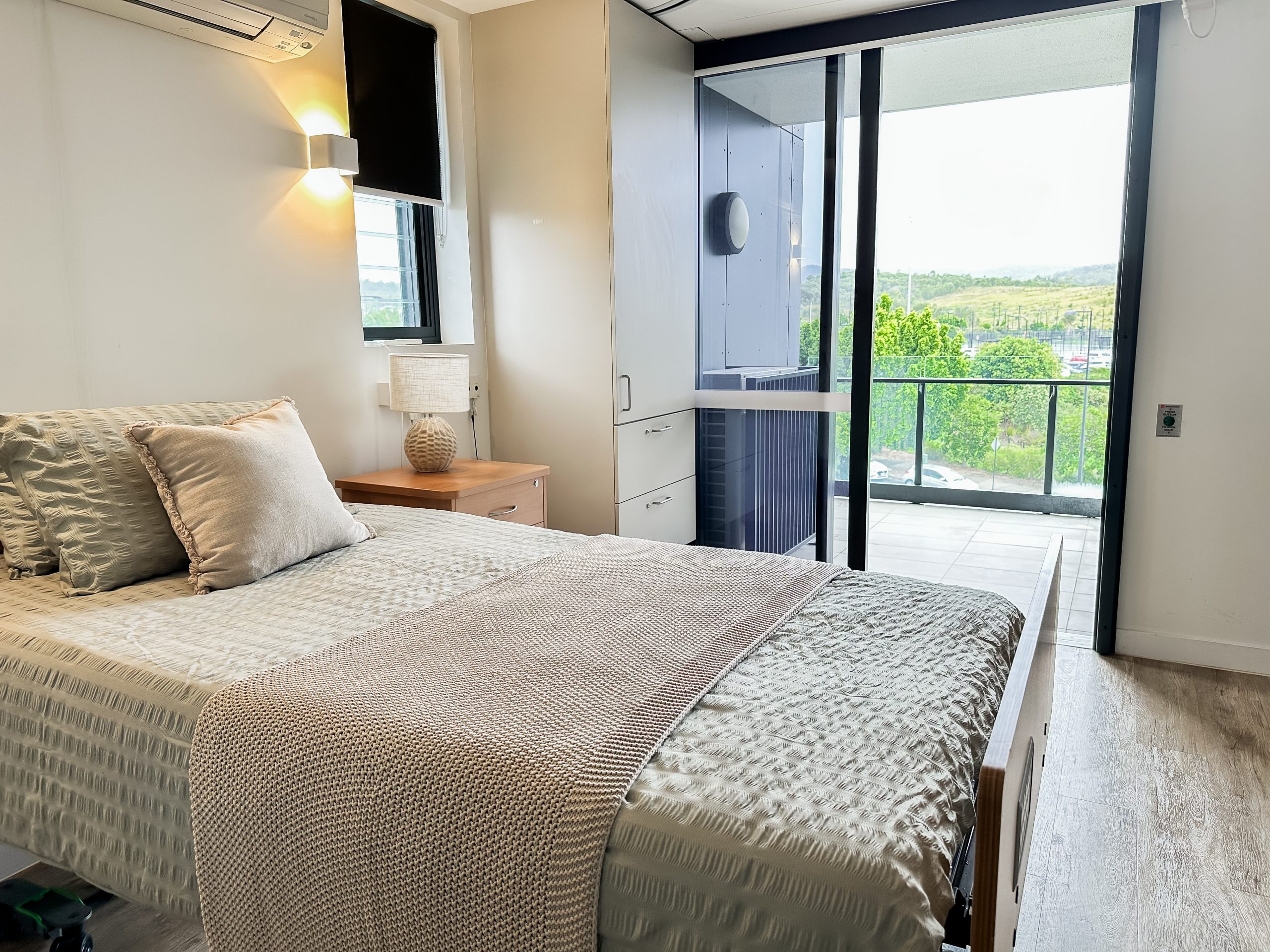 Each apartment boasts a spacious, open-plan bedroom designed for comfort and accessibility. The bedroom includes ample space for easy movement, ceiling provisions for a hoist, and a large roll-in ensuite, ensuring both convenience and a touch of luxury